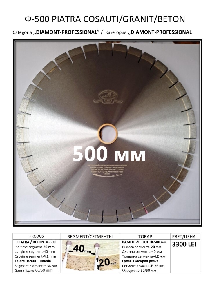 Алмазный диск для обработки камня 500 мм, цена 3300 лей, диск алмазный диаметр 500 мм высота алмазного сегмента 20 мм для резки песчаника и других натуральных камней, оптовые цены по запросу. Купить диск для камня с большим ресурсом. Доставка курьером.